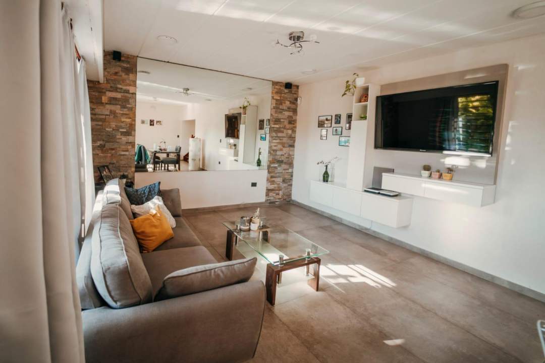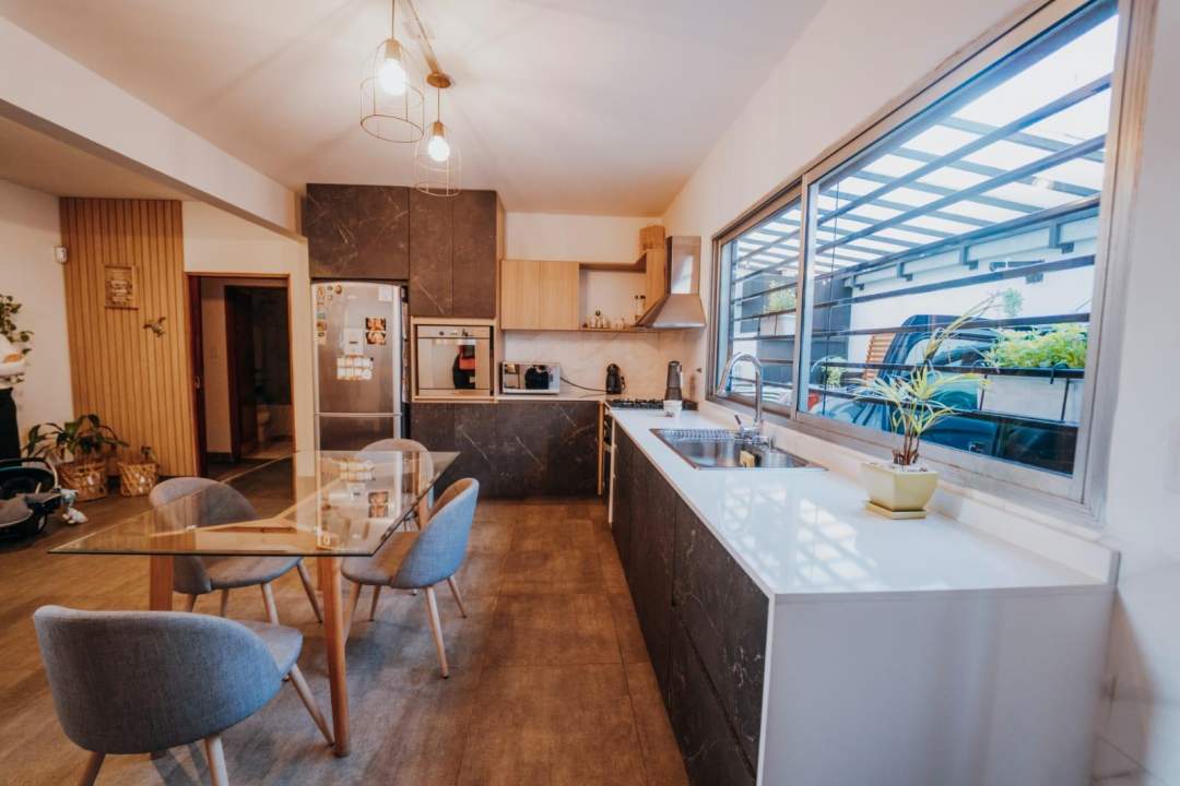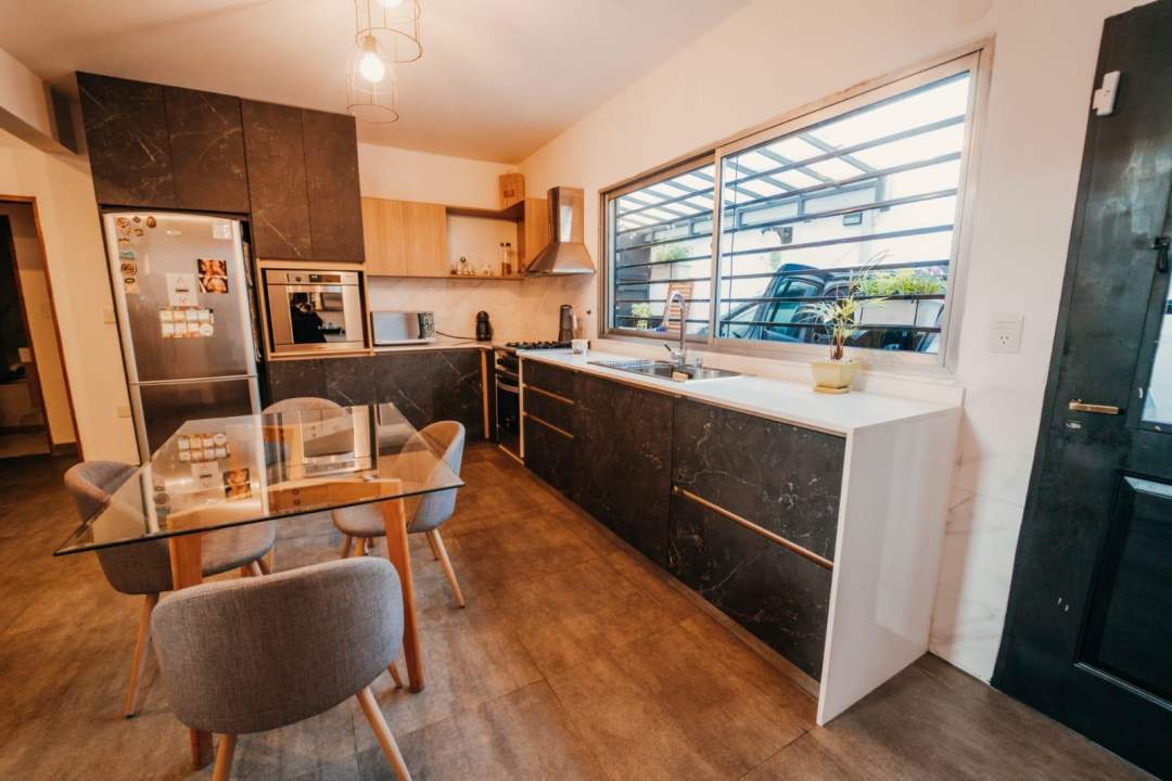 Planta baja: Living-comedor con escalera de mármol, cocina-comedor, una habitación funcional, antebaño y baño completo.